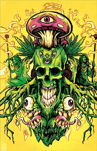 This tray features a trippy, psychedelic green natural skull with mushrooms and pot plants coming out of it. Brand: Eye Candy. Size: 7″ x 11″